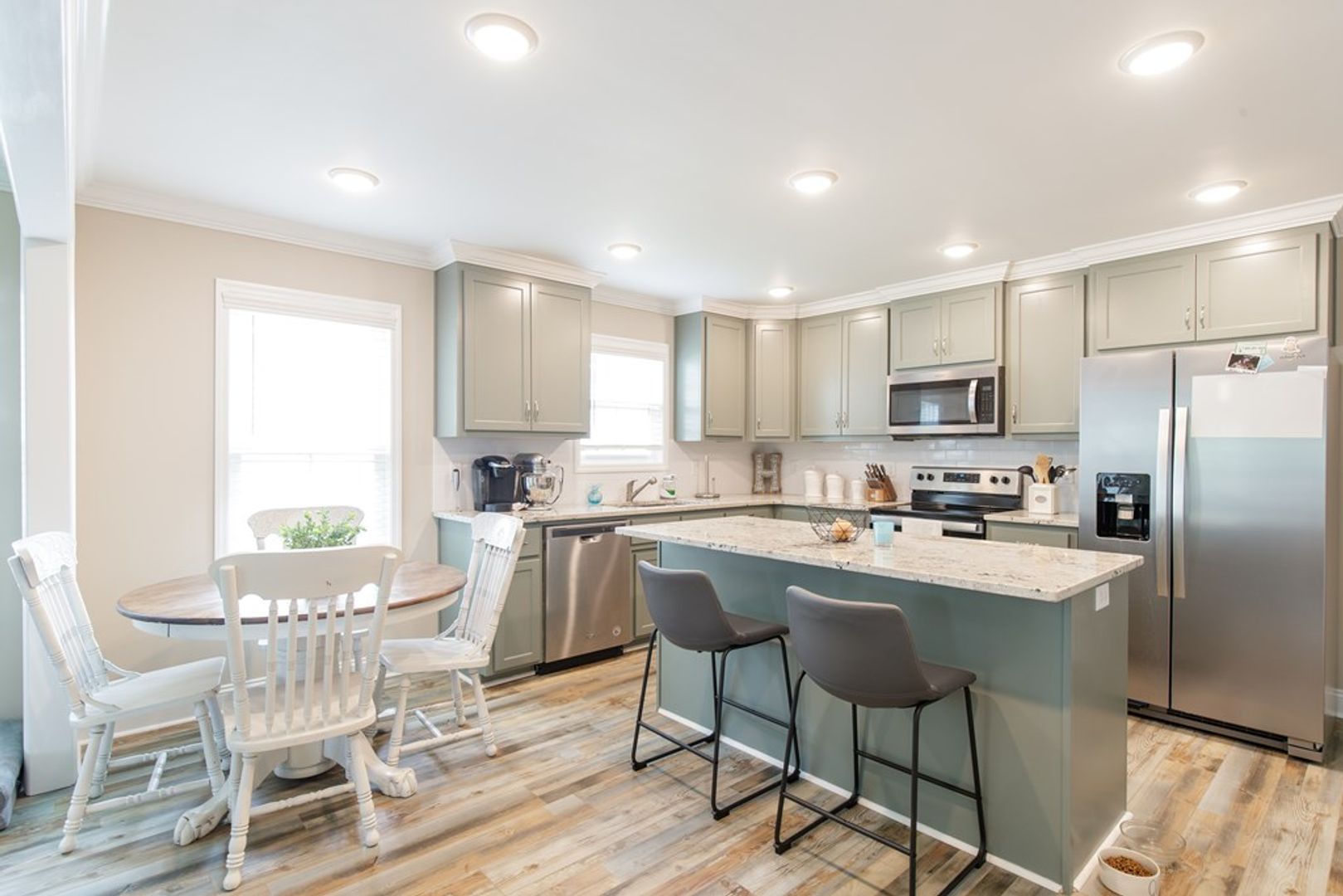 As you step inside, you'll be greeted by the stunning vinyl siding exterior and the inviting warmth of rustic wood Luxury Vinyl Plank (LVP) flooring in the common areas. The bedrooms are carpeted for cozy relaxation, while the kitchen shines with granite countertops, an abundance of cabinet space, and a convenient island for food prep and extra countertop room. Stainless steel appliances, including a fridge, stove, dishwasher, and microwave, complete the sleek and modern kitchen.
