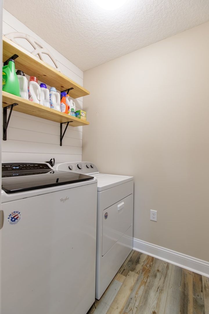 Laundry chores are a breeze in the spacious laundry room, equipped with washer and dryer hookups and ample cabinet space for organization. Your outdoor oasis awaits in the large, fenced backyard, complete with a covered back porch, perfect for enjoying Georgia's pleasant weather.