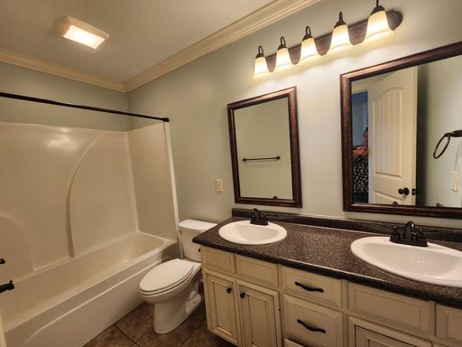 The master bathroom is a true retreat with its double sink vanities, soaker tub/shower combo, and elegant trey ceiling. The guest bathroom also features double vanities, perfect for families or roommates.