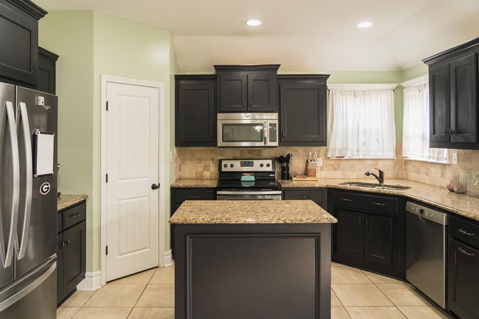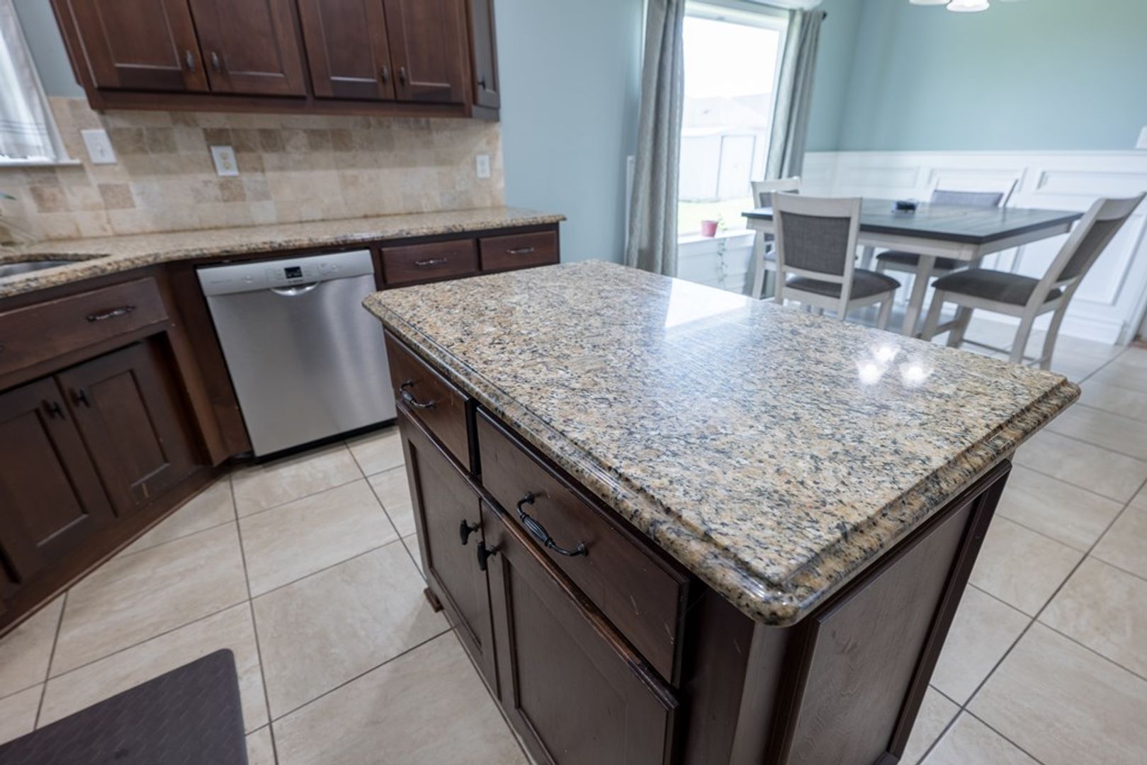 The kitchen is a chef’s dream, featuring abundant cabinet storage, sleek granite countertops, a stylish tile backsplash, and a spacious island that serves as the perfect gathering spot. Stainless steel appliances, including a stove, refrigerator, microwave, and dishwasher, offer both modern convenience and sophistication. Recessed can lighting illuminates the space, while windows by the sink allow natural light to brighten the room. A formal dining area sits just off the kitchen, providing a lovely setting for meals and special occasions.