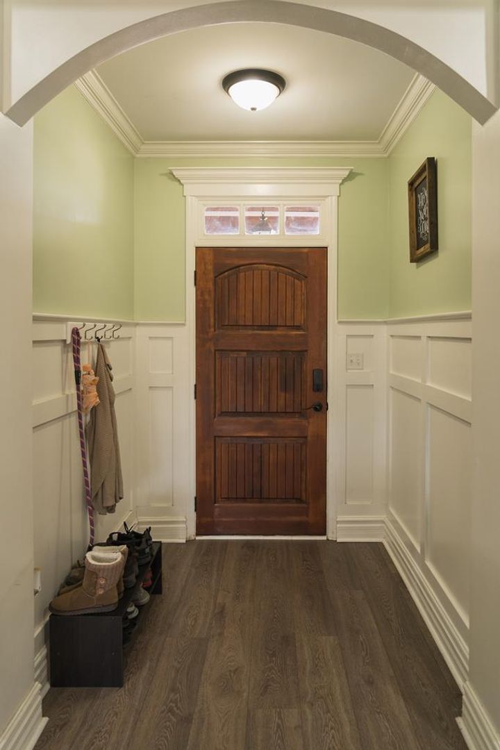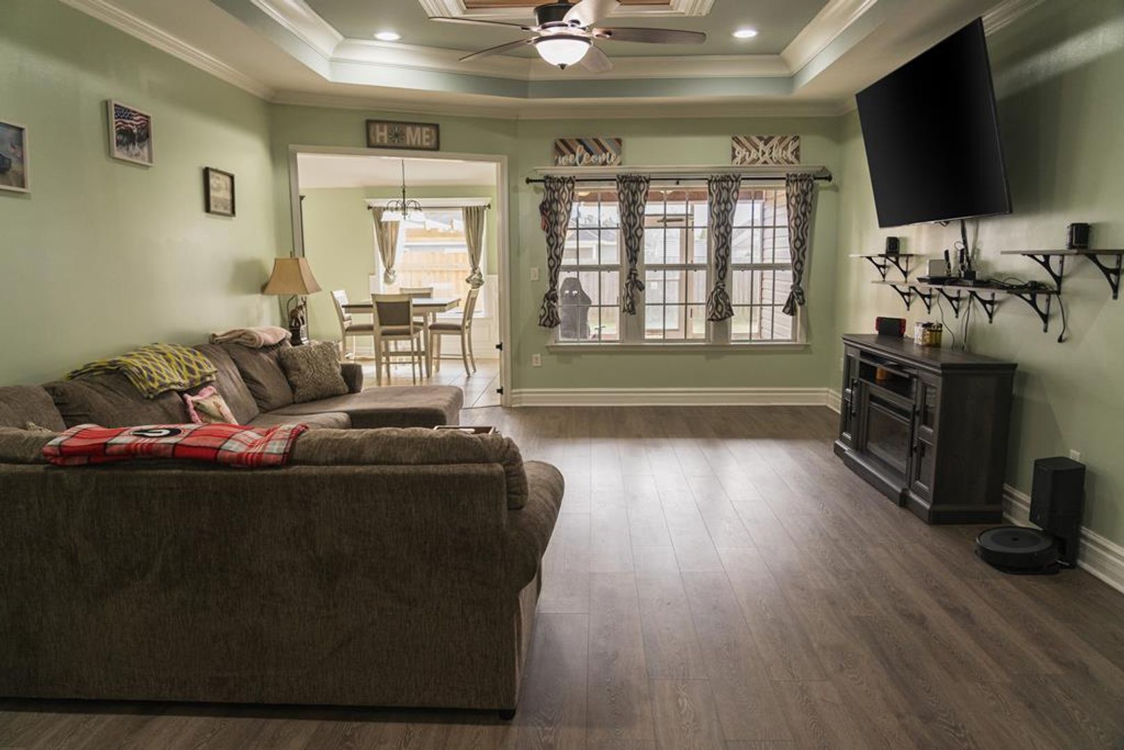 As you step inside, you’re welcomed into a charming foyer entry that leads to a beautifully designed living room. This inviting space is highlighted by rich hardwood flooring, a cozy fireplace, elegant tray ceilings, and a ceiling fan, creating a warm and comfortable atmosphere. The open layout seamlessly connects to the kitchen, making it perfect for entertaining and everyday living.
