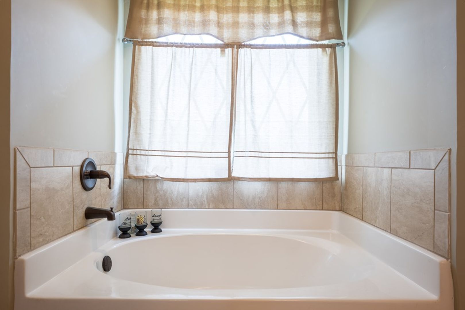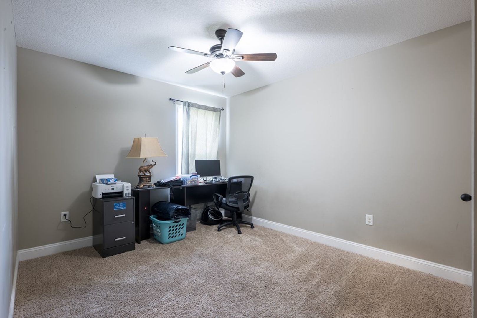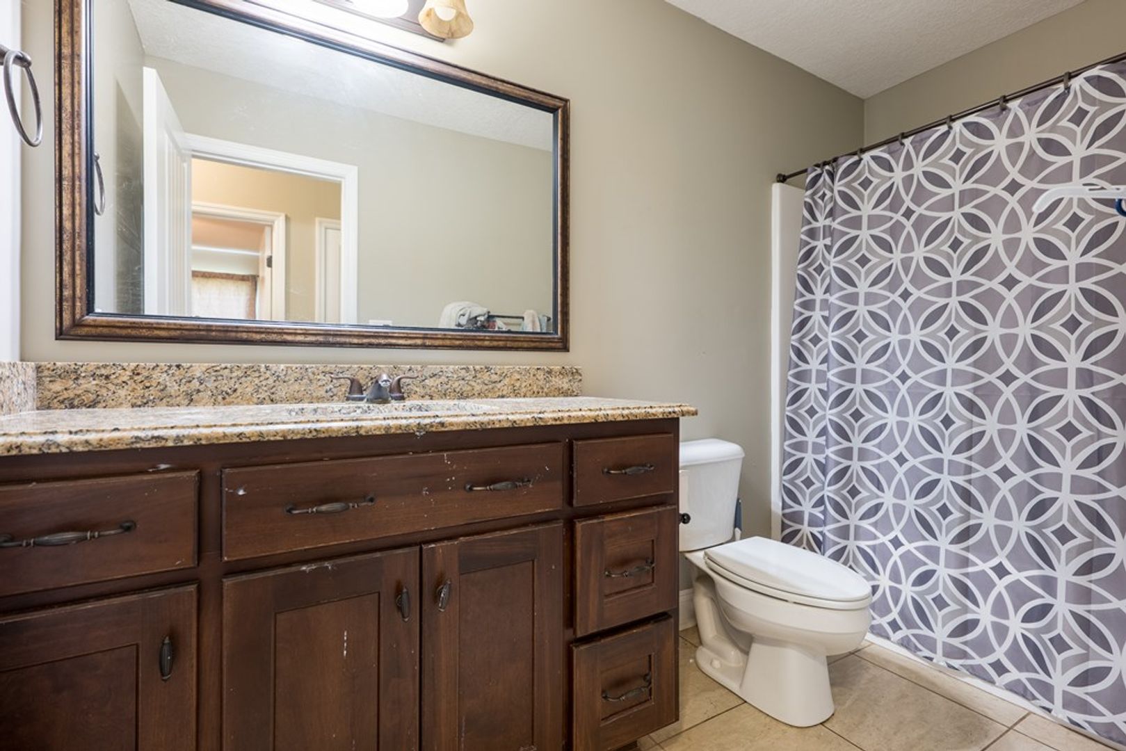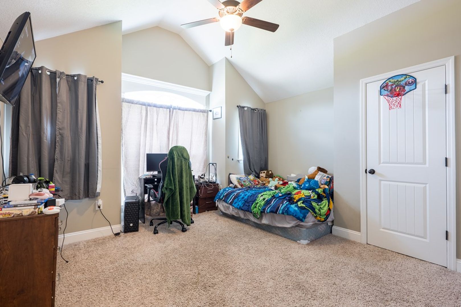 Three additional spacious guest bedrooms are located on the opposite side of the home, each featuring vaulted ceilings, beautiful windows, soft carpet, and ceiling fans for year-round comfort. The guest bathroom includes a tub/shower combo and a granite-topped vanity, providing a stylish and functional space for family or visitors.