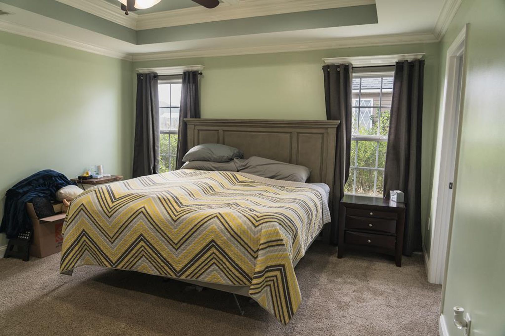 The luxurious master suite offers a serene retreat with plush carpet, a tray ceiling, ceiling fan, and ample space for relaxation. The en-suite master bathroom is equally impressive, boasting a large tile shower, a garden tub for soaking, dual vanities with granite countertops, and two expansive walk-in closets, ensuring plenty of storage.