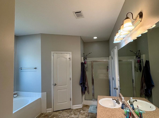 The primary suite offers a relaxing retreat with carpet flooring, a tray ceiling, and a ceiling fan. The en-suite bathroom includes tile flooring, a double vanity, and a walk-in shower for added comfort and convenience. The additional bedrooms are well-sized with carpet flooring and ceiling fans, and the guest bathroom features tile flooring and a tub/shower combination.