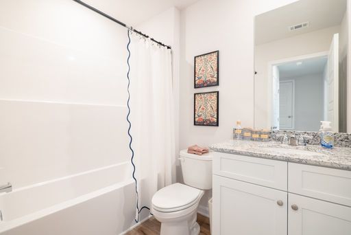 Two guest bedrooms—both carpeted—provide comfortable secondary spaces, perfect for additional occupants, guests, or flexible-use rooms. The upstairs guest bathroom features LVP flooring, a convenient tub/shower combo, and a granite countertop for a cohesive look throughout the home.