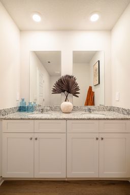 Upstairs, the primary bedroom offers a comfortable retreat with soft carpet underfoot and enough space to accommodate a king-size bed with ease. The walk-in closet provides excellent storage. The primary bathroom continues the home’s upscale feel with a walk-in shower, a double vanity topped with granite, and built-in shelving that keeps everyday essentials neatly stored.
