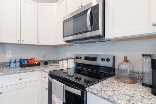 The kitchen is a standout feature with its stainless steel appliances—including a stove, refrigerator, dishwasher, and microwave—paired with granite countertops that add a polished touch. The kitchen island with bar-top seating creates a natural gathering spot, while the pantry, generous cabinetry, and abundant counter space ensure everything has its place. Additional can lighting adds warmth and keeps the kitchen bright and inviting.