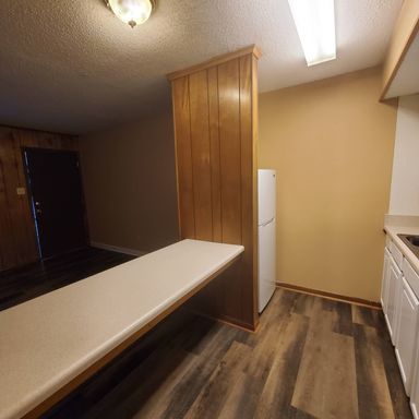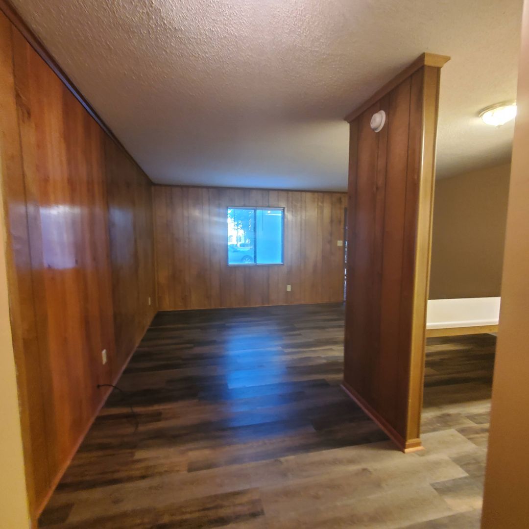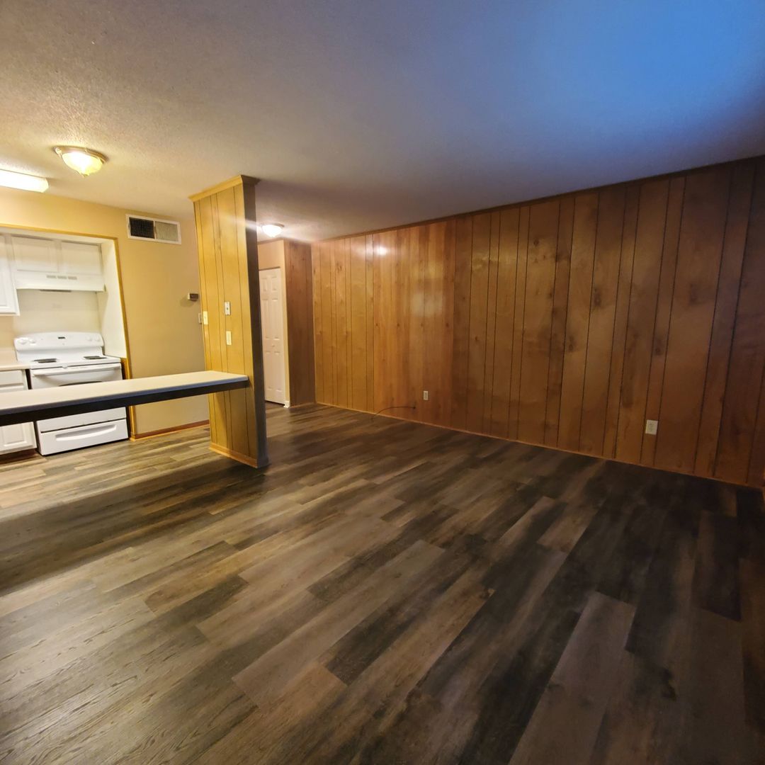 Inside, you'll find updated flooring, with LVP in the common areas and plush carpet in the bedroom and closet. The kitchen comes complete with essential appliances, including a stove and fridge. One unique feature is the charming wood panel walls, creating a warm and inviting atmosphere. Plus, you'll appreciate the built-in serving bar in the kitchen, perfect for meal prep and entertaining.