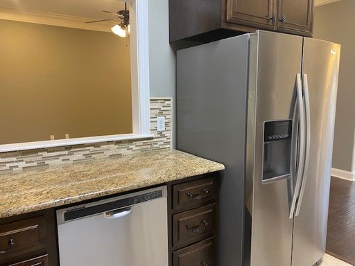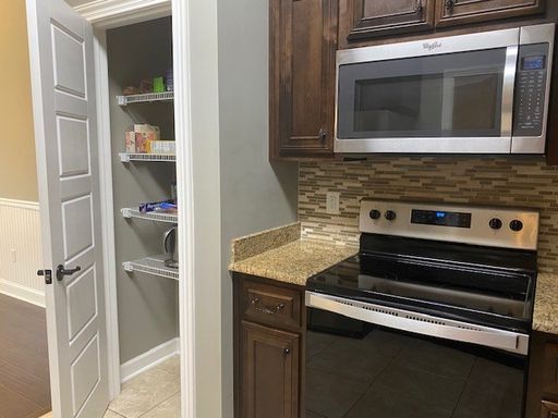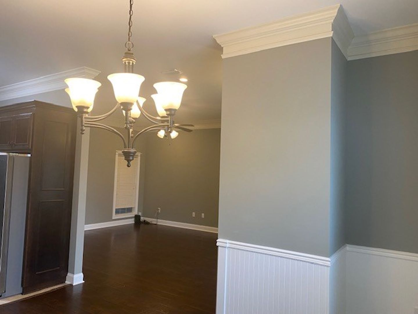 As you step inside, you'll be greeted by a spacious 1664 sq ft open floor plan featuring distressed engineered hardwood flooring in the living room area, crown trim throughout, and wainscoting & chair rail trim in the formal breakfast nook. The kitchen is a chef's dream with stainless steel appliances, a stylish tile design backsplash, an island for food prep, and plenty of cabinet space. A serving window connects it seamlessly to the dining area and living room.