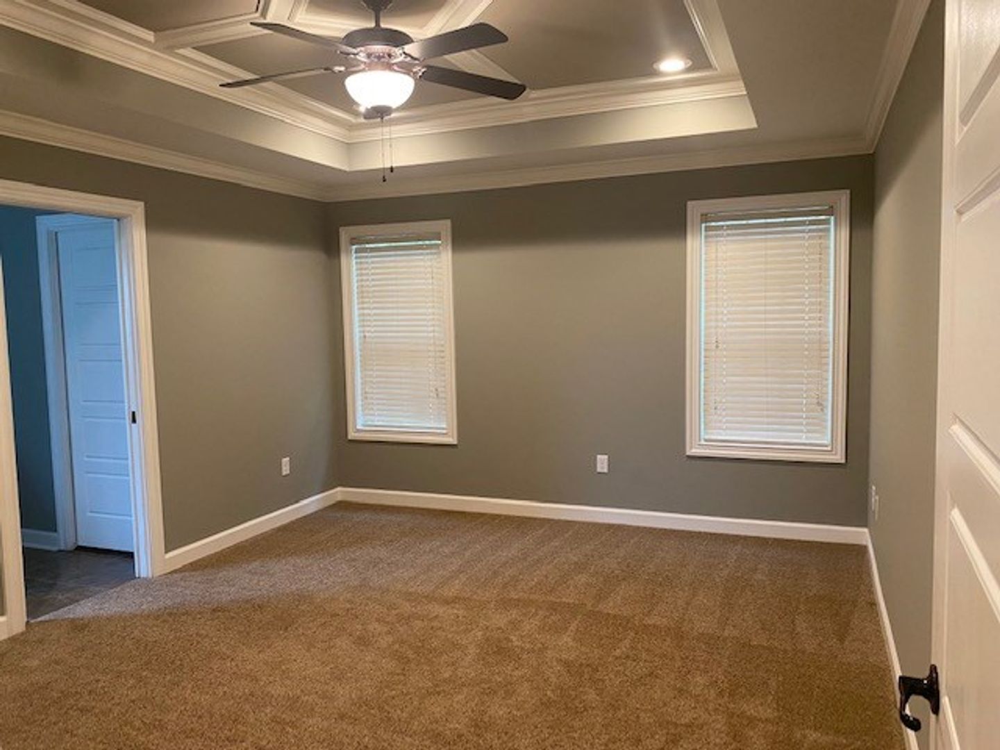 The master bedroom is truly a retreat with ornate crown trim design in the trey ceiling and a large walk-in closet. The master bathroom boasts granite countertops with a double sink vanity, a large soaker tub, and a separate walk-in shower with a built-in seat.