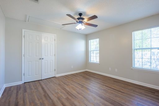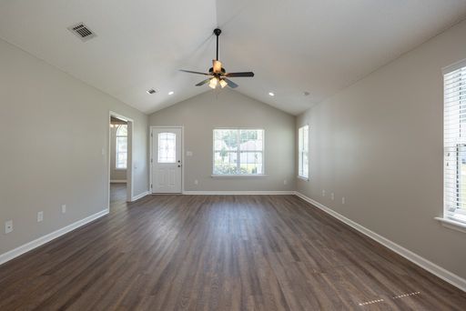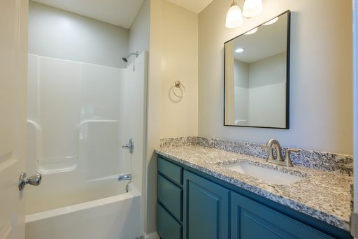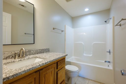 Guest bedrooms are generously sized and feature LVP flooring, ceiling fans, and vaulted ceilings that add to the airy feel of the home. The guest bathroom includes tile flooring and a tub and shower combination, providing convenience and functionality for occupants and guests.