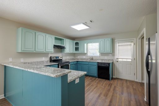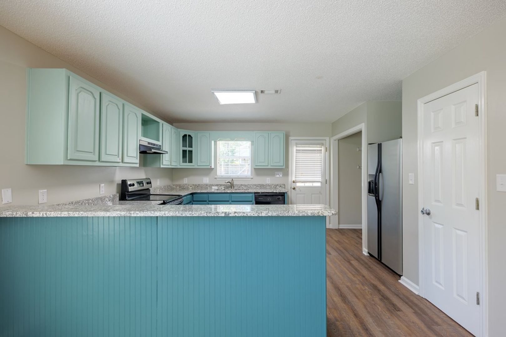 The kitchen is designed with both style and functionality in mind. Tile flooring complements the stainless steel appliance package, which includes a stove, refrigerator, and dishwasher. A large peninsula with bar-top seating provides additional workspace and casual dining options, while ample cabinetry and counter space support efficient organization. A pantry adds extra storage, and the window above the sink brings in natural light while maintaining an open connection to the adjacent dining area.