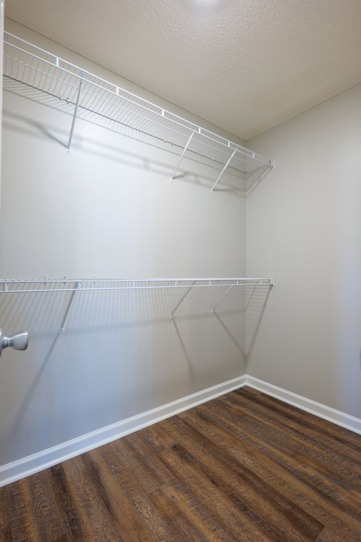 The primary bedroom offers a comfortable retreat with LVP flooring, a ceiling fan, and a spacious walk-in closet. The attached primary bathroom features tile flooring, a tub and shower combination, and an extended countertop surrounding the single sink, offering plenty of surface space for daily routines.
